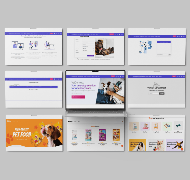 An online appointment booking system was developed with automated email notifications for approved, pending, or rejected requests. An AI-powered virtual assistant was created to interact with users, analyze common pet symptoms, and provide basic guidance. Additionally, a complete e-commerce section was built to manage and display pet products, along with responsive layouts to ensure smooth user experience across all devices.